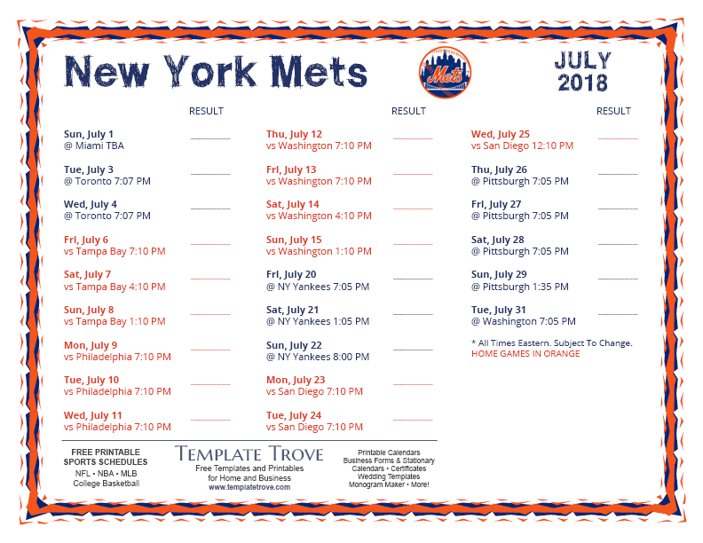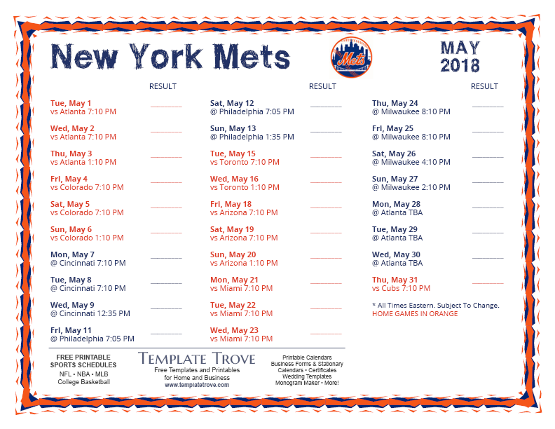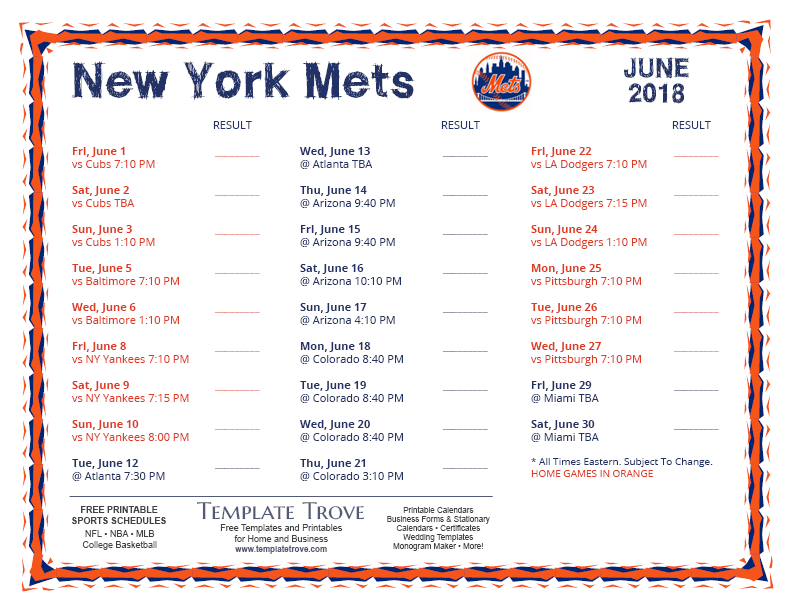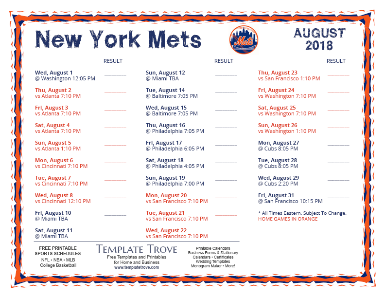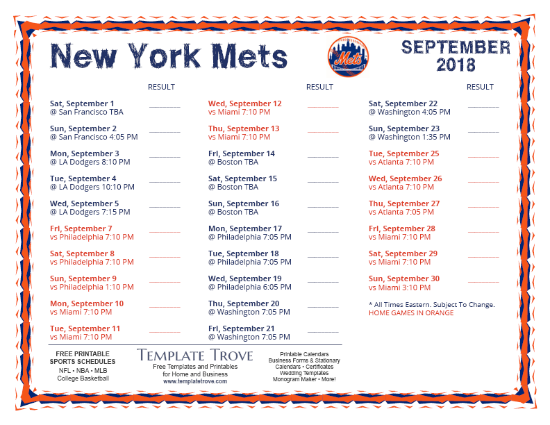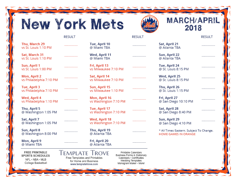 Keep up with the 2018 New York Mets with our handy printable schedules, now available for each US time zone.