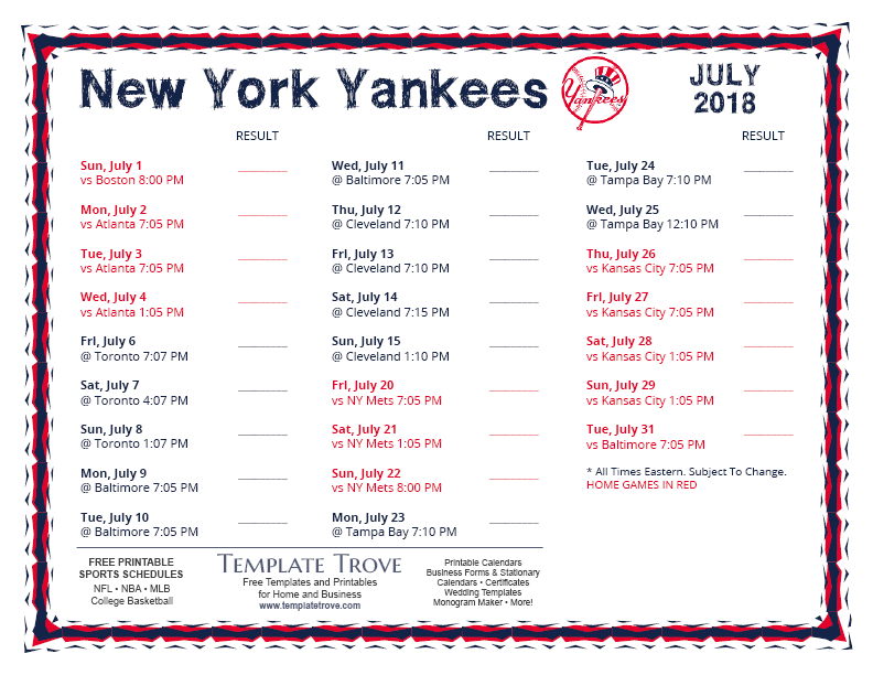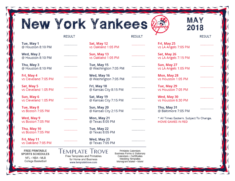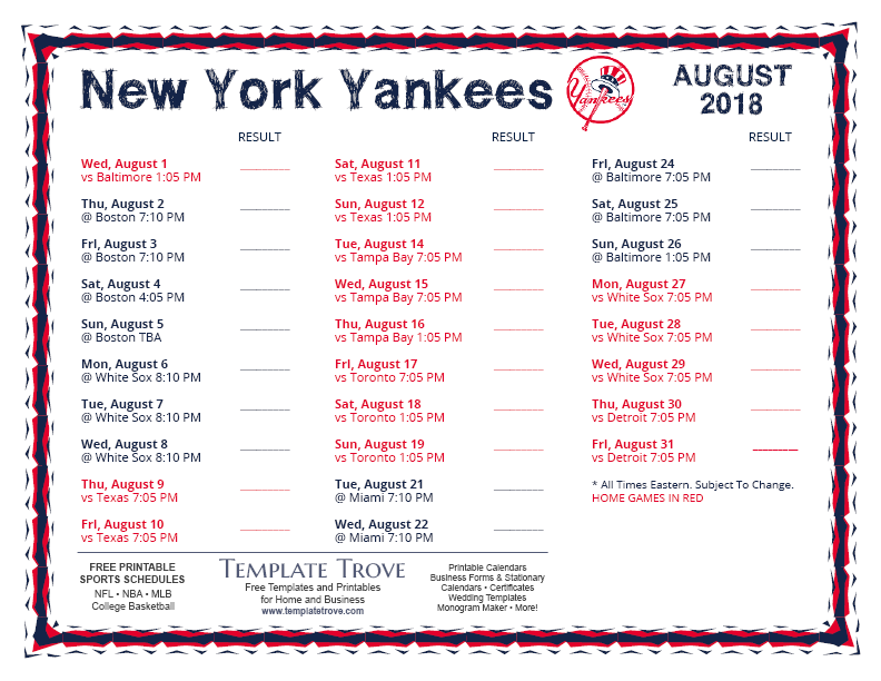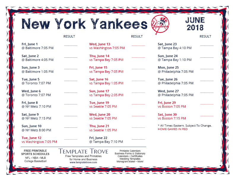 Keep up with the 2018 New York Yankees with our handy printable schedules, now available for each US time zone.