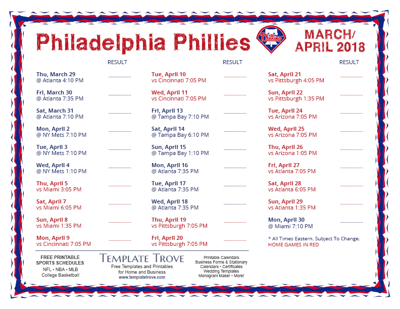 March/April 2018 Phillies Schedule