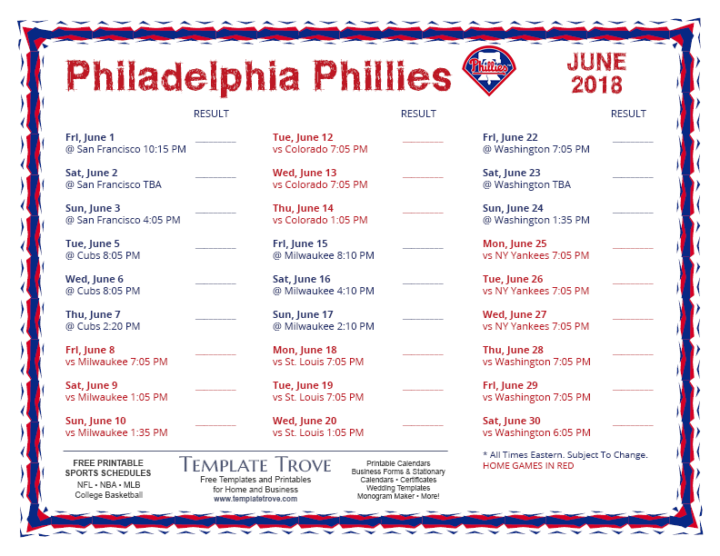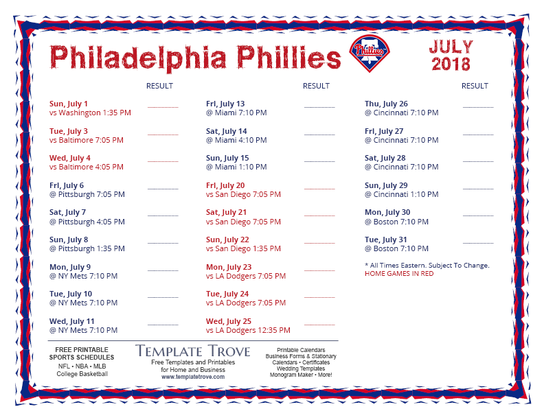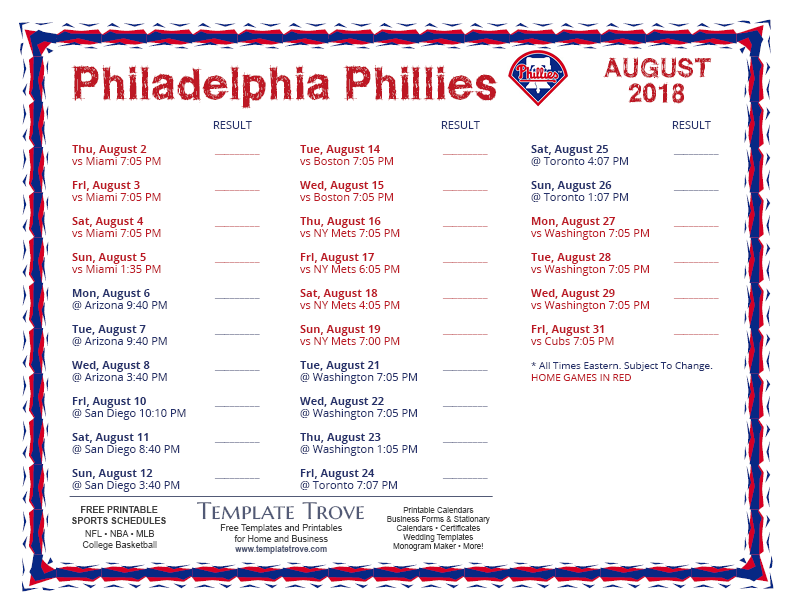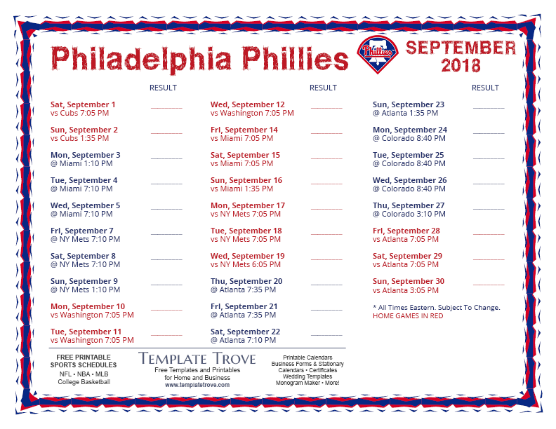 Keep up with the 2018 Philadelphia Phillies with our handy printable schedules, now available for each US time zone.