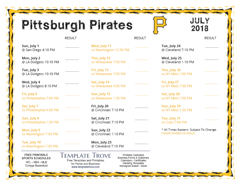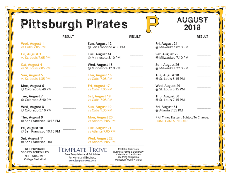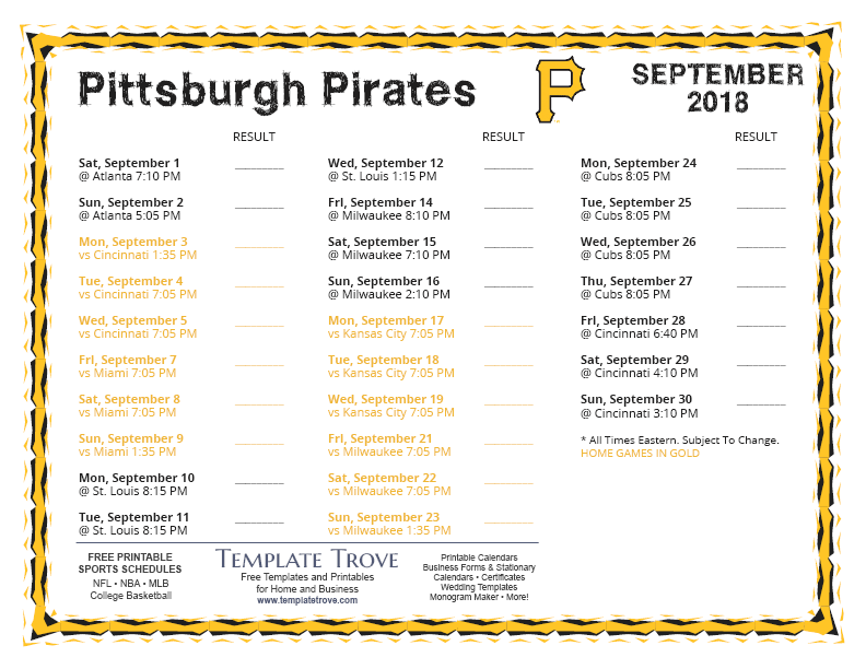 Keep up with the 2018 Pittsburgh Pirates with our handy printable schedules, now available for each US time zone.