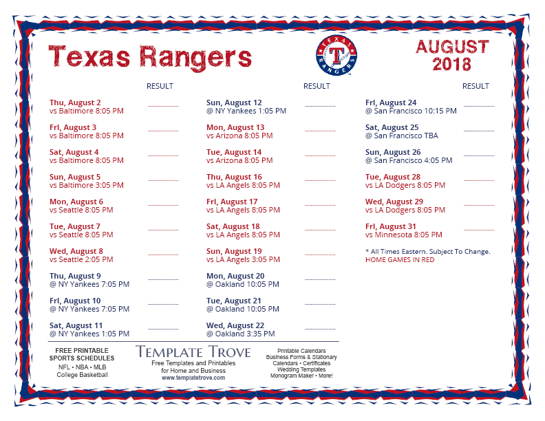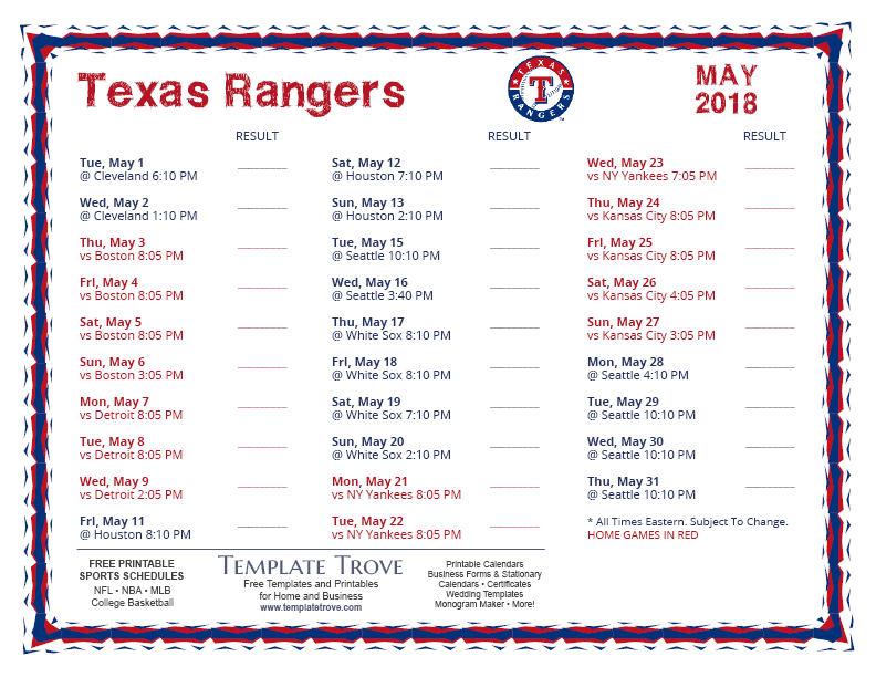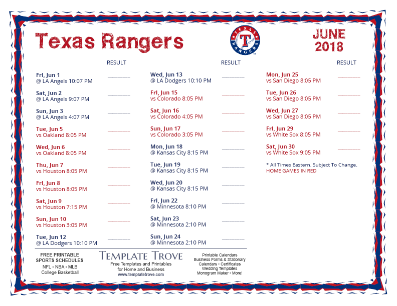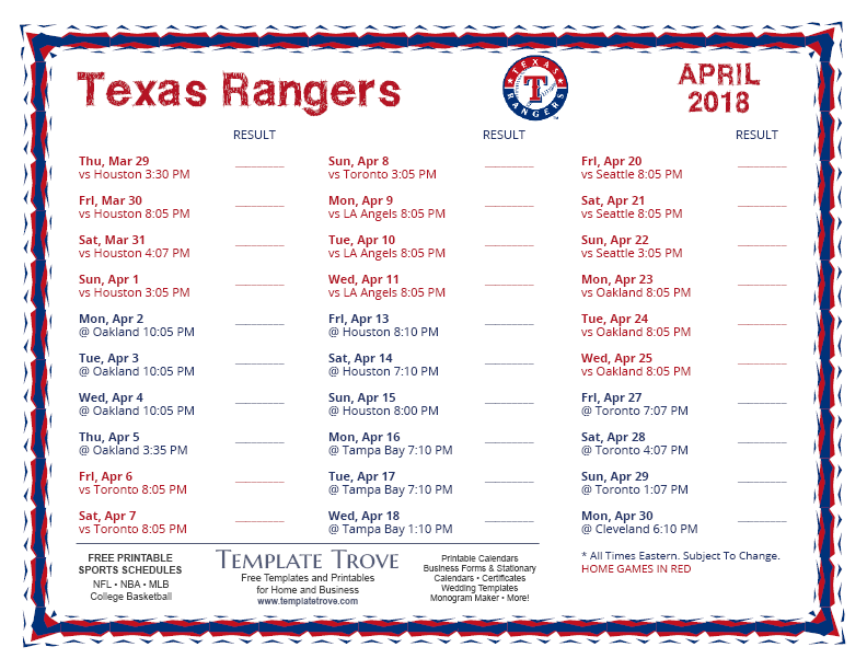 Keep up with the 2018 Texas Rangers with our handy printable schedules, now available for each US time zone.