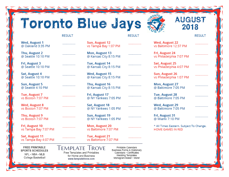 August 2018 Blue Jays Schedule