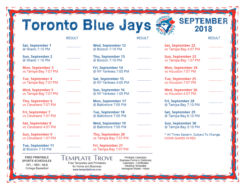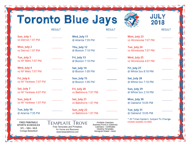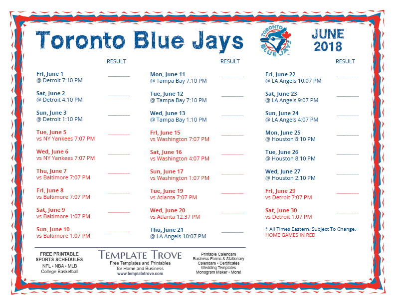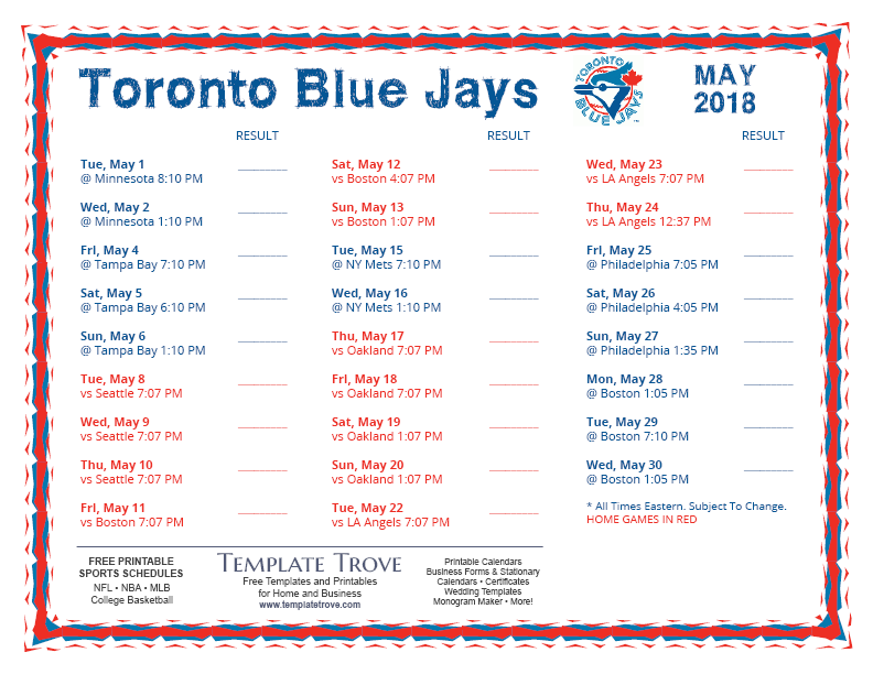 Keep up with the 2018 Toronto Blue Jays with our handy printable schedules, now available for each US time zone.
