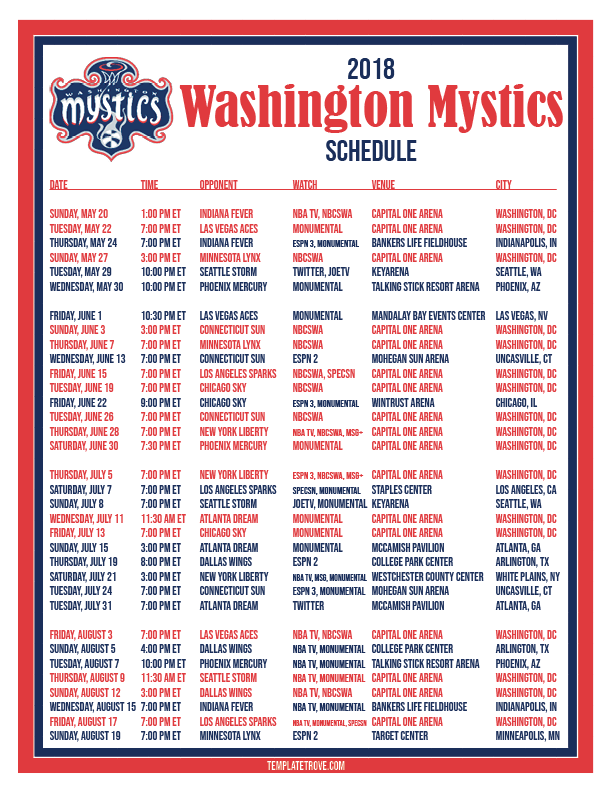 Keep up with the Washington Mystics basketball team in the 2018 season with our free printable regular season schedules.Schedules print on 8 1/2" x 11" paper. Click thumbnails of schedules to enlarge.