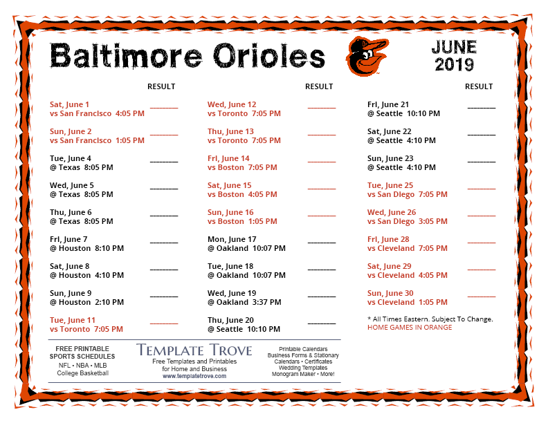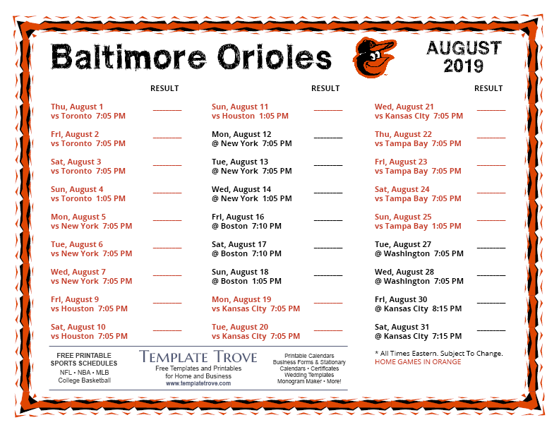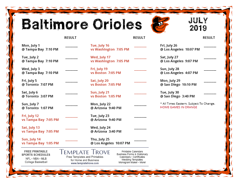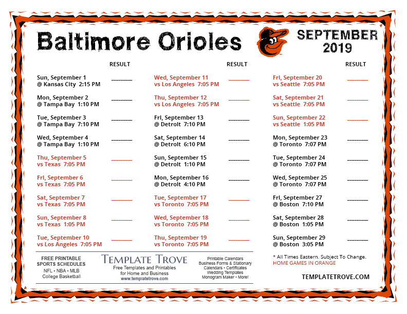 Keep up with the 2019 Baltimore Orioles with our handy printable schedules, now available for each US time zone.