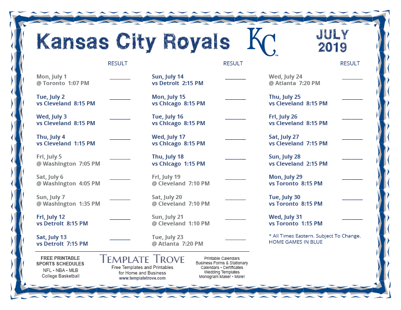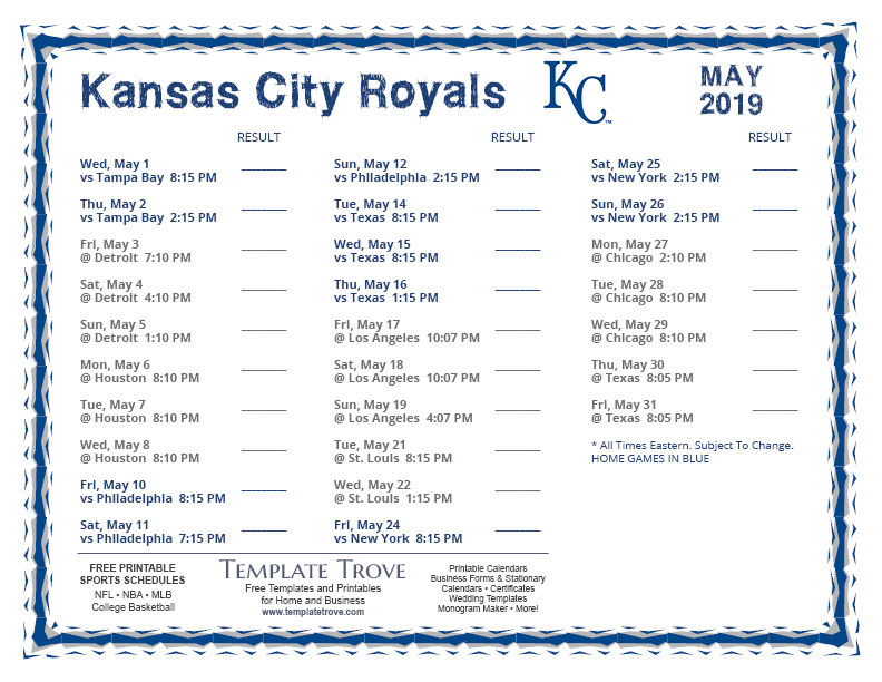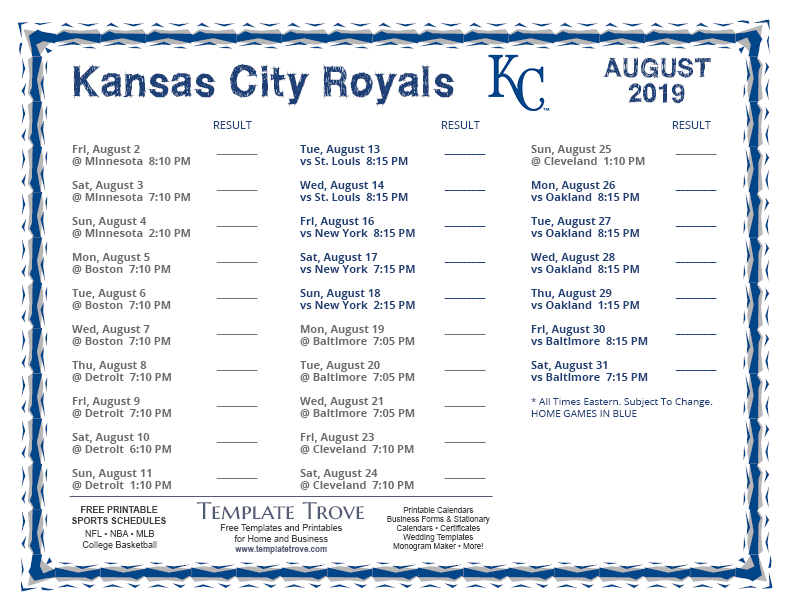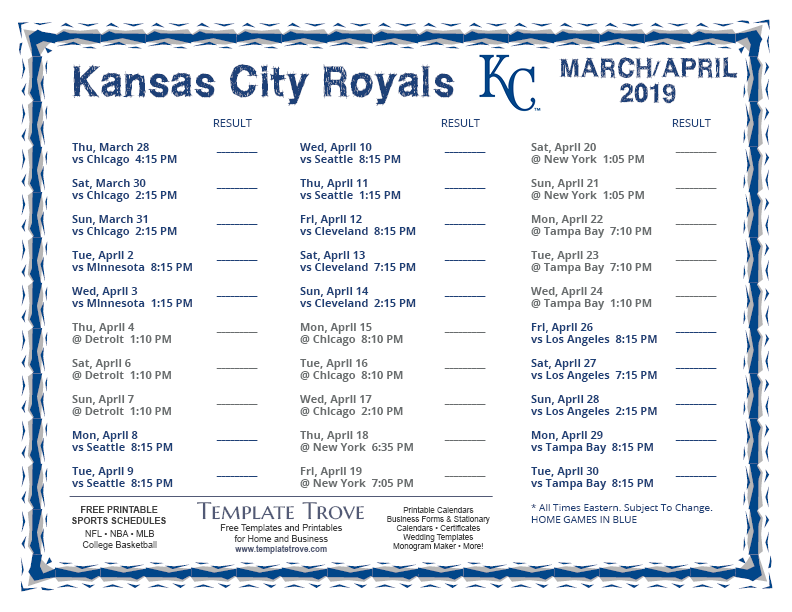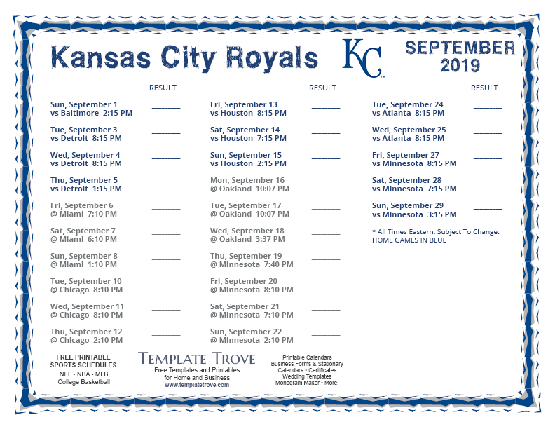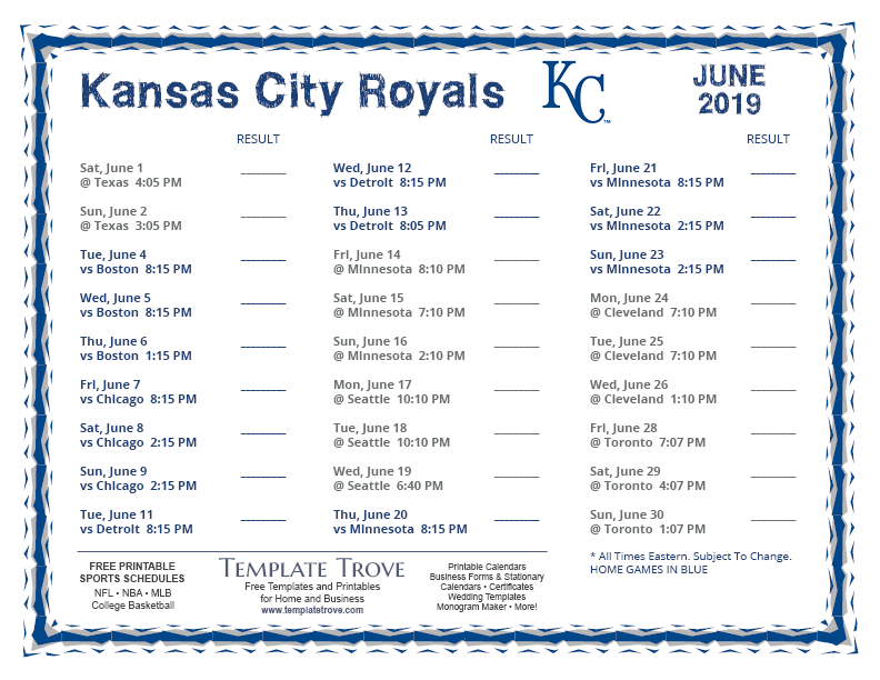 Keep up with the 2019 Kansas City Royals with our handy printable schedules, now available for each US time zone.