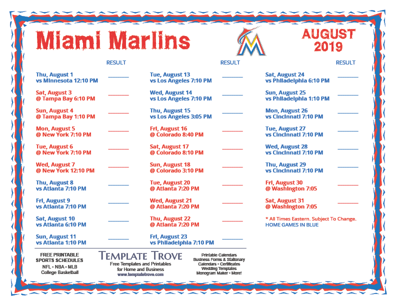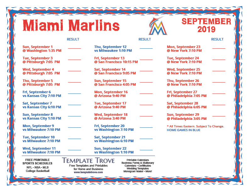 Keep up with the 2019 Miami Marlins with our handy printable schedules, now available for each US time zone.