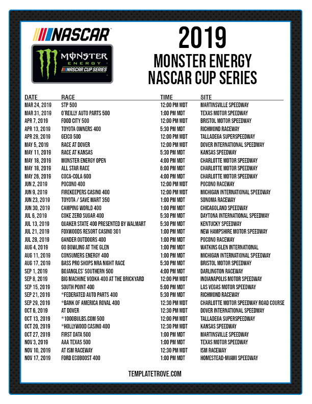 Keep up with the races with our printable 2019 NASCAR schedules. Available for each United States time zone.Schedules print on 8 1/2" x 11" paper.