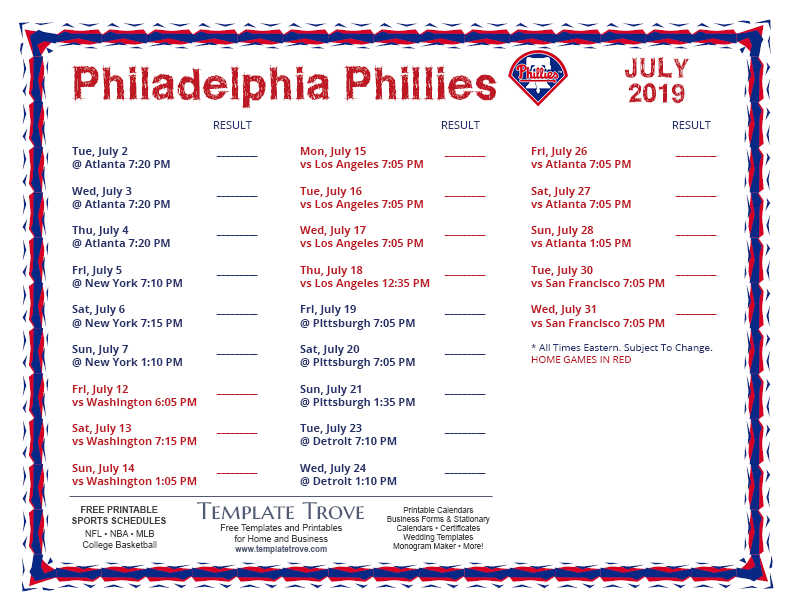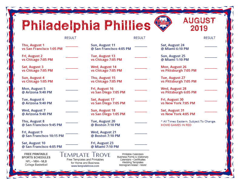 Keep up with the 2019 Philadelphia Phillies with our handy printable schedules, now available for each US time zone.