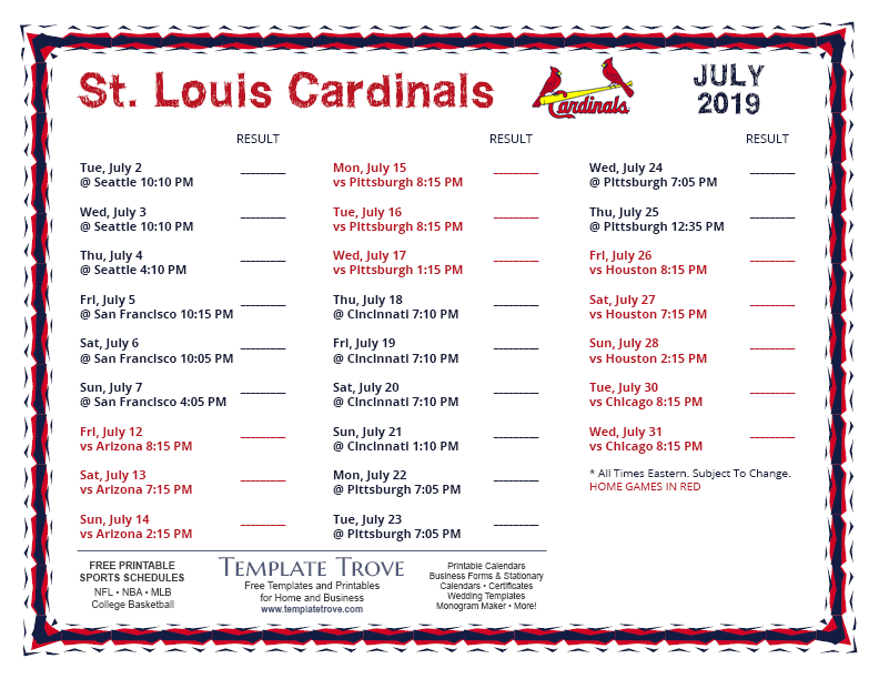 Keep up with the 2019 St. Louis Cardinals with our handy printable schedules, now available for each US time zone.
