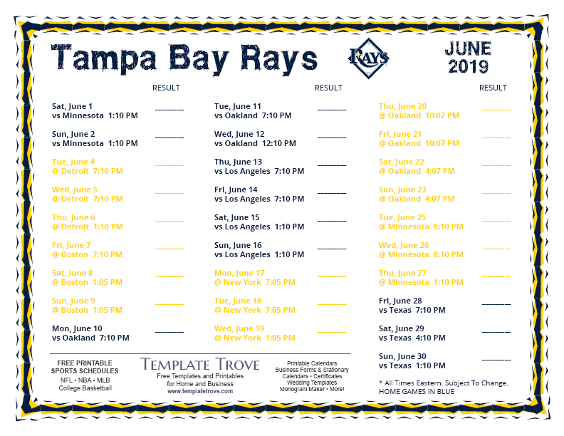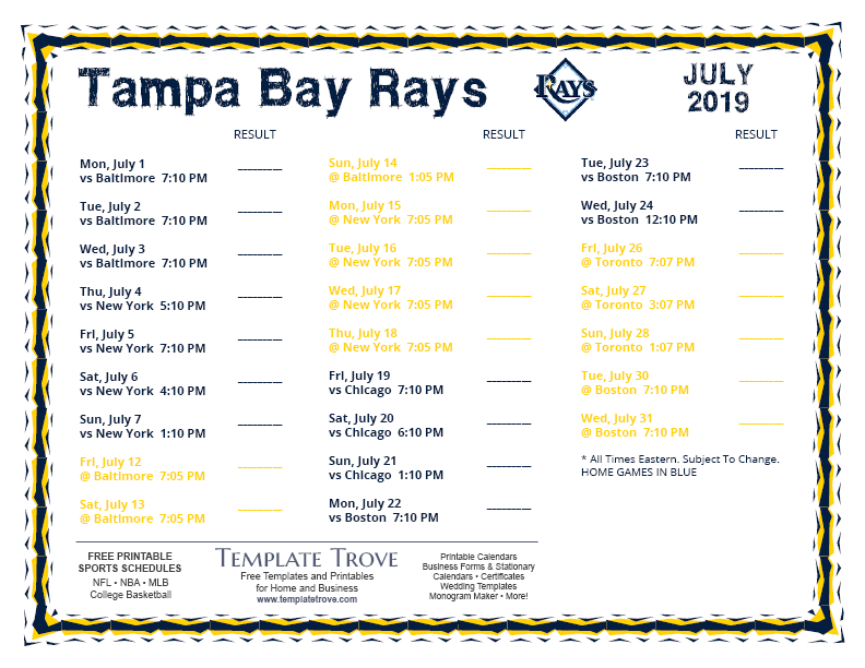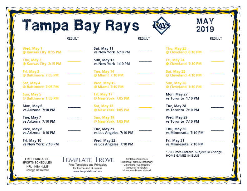 Keep up with the 2019 Tampa Bay Rays with our handy printable schedules, now available for each US time zone.
