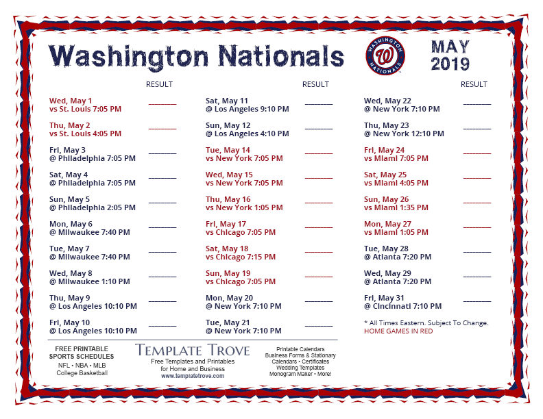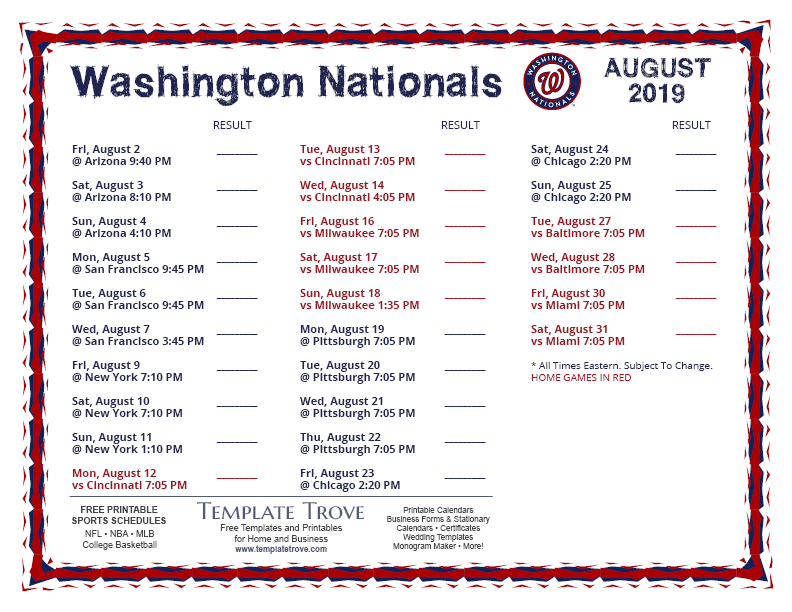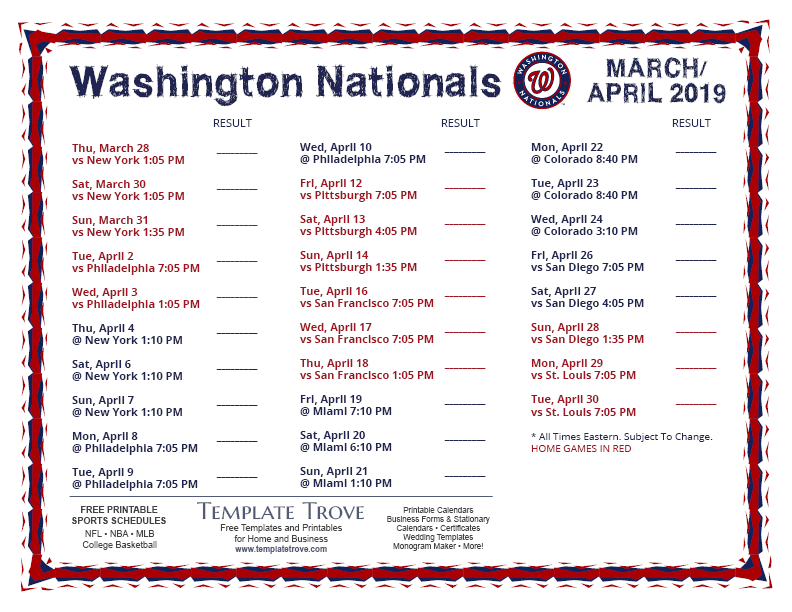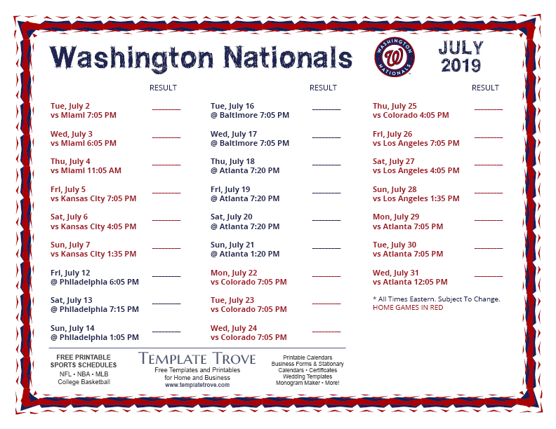 Keep up with the 2019 Washington Nationals with our handy printable schedules, now available for each US time zone.