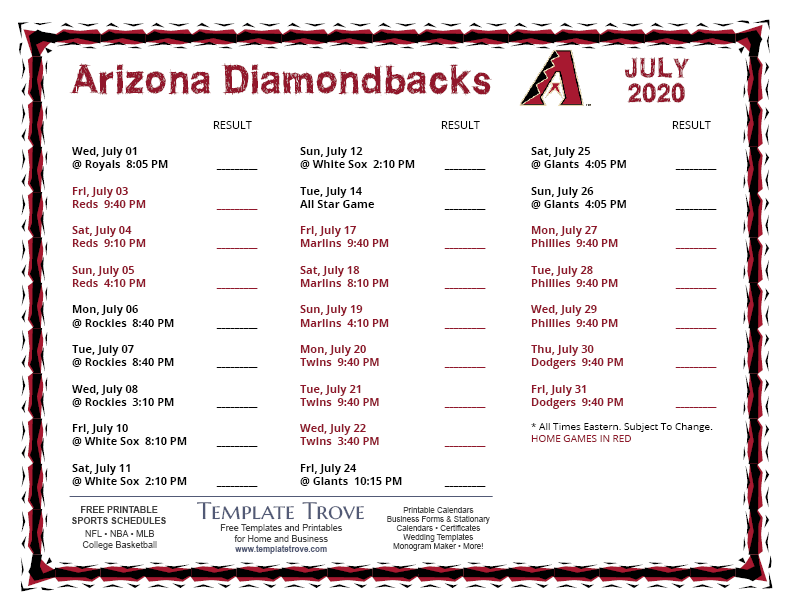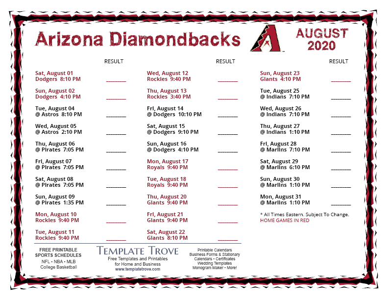Keep up with the 2020 Arizona Diamondbacks with our handy printable schedules, now available for each US time zone.