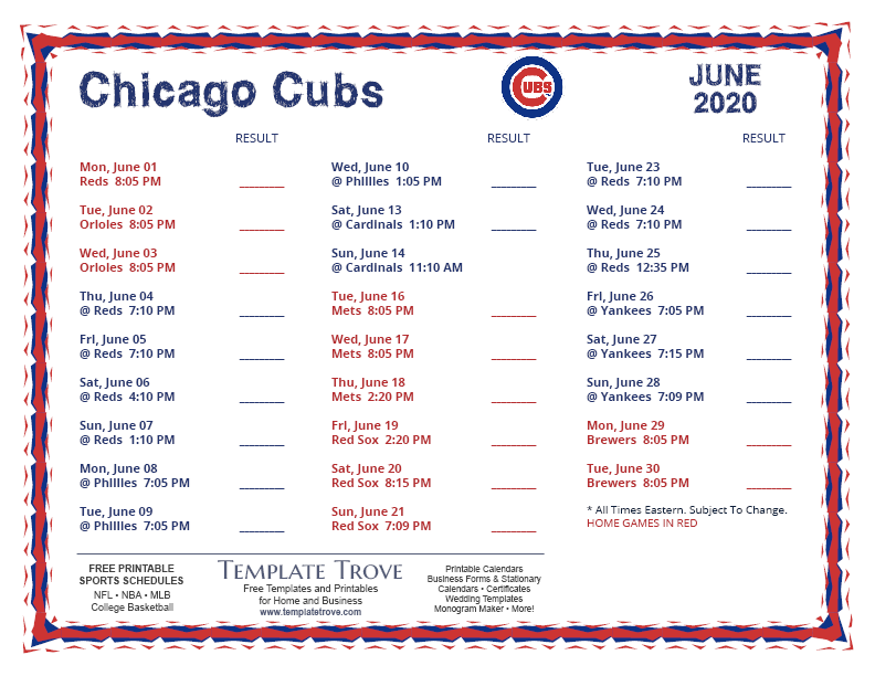 Keep up with the 2020 Chicago Cubs with our handy printable schedules, now available for each US time zone.