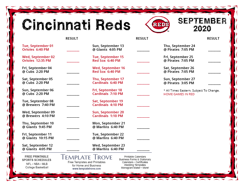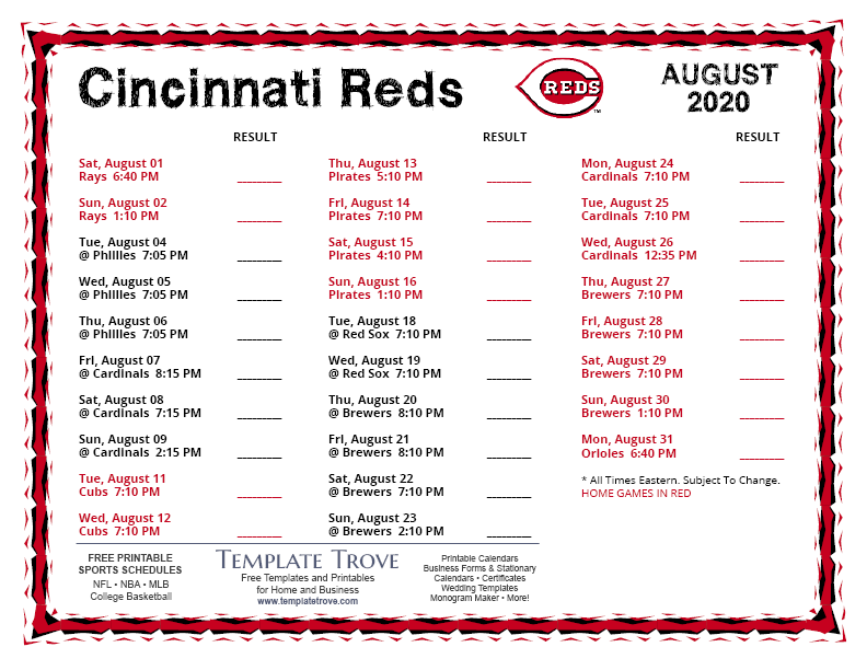 Keep up with the 2020 Cincinnati Reds with our handy printable schedules, now available for each US time zone.