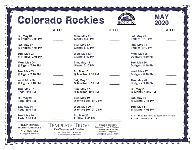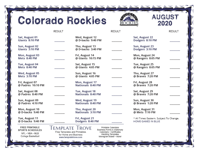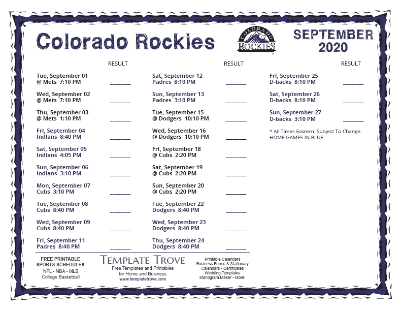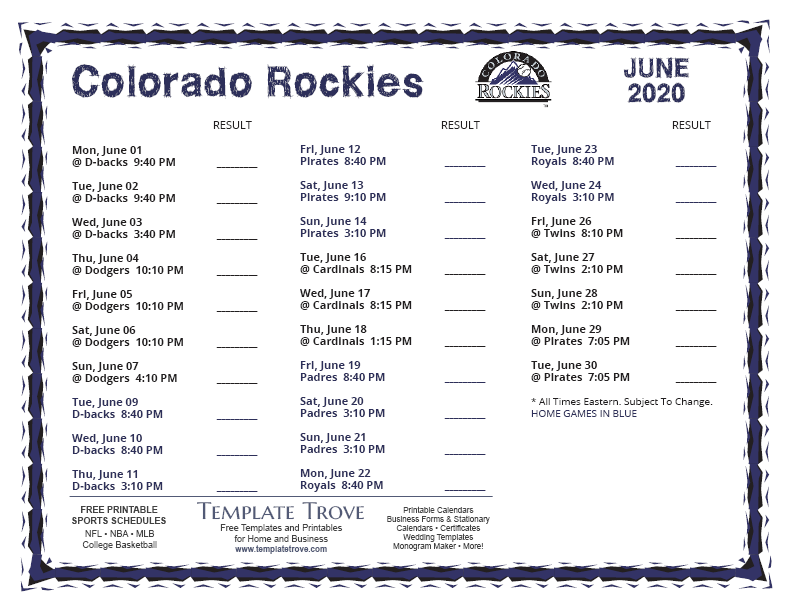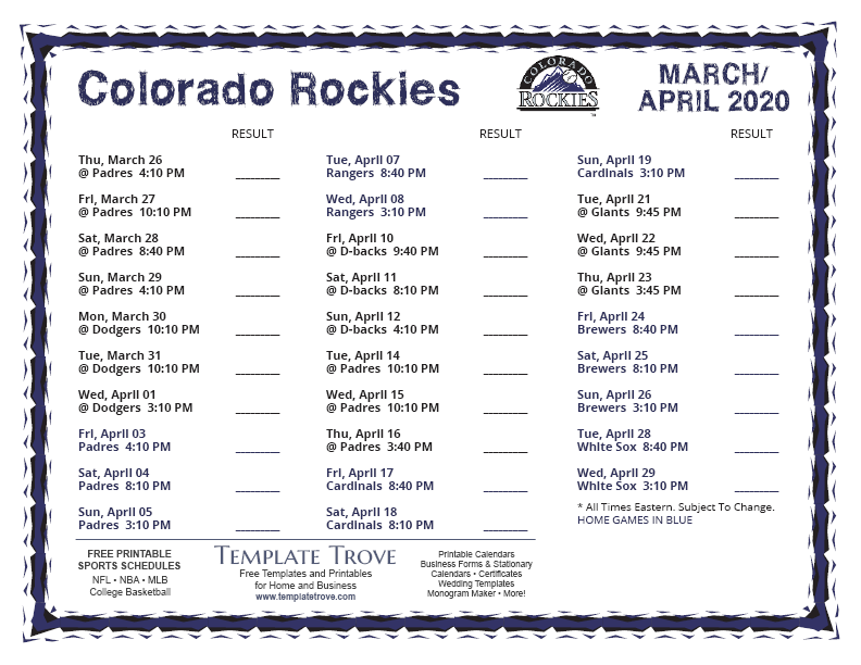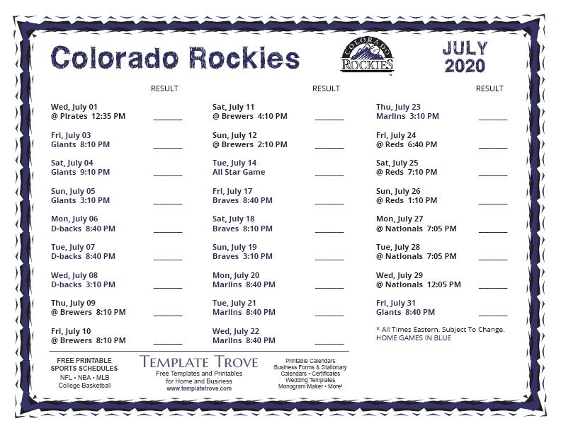 Keep up with the 2020 Colorado Rockies with our handy printable schedules, now available for each US time zone.