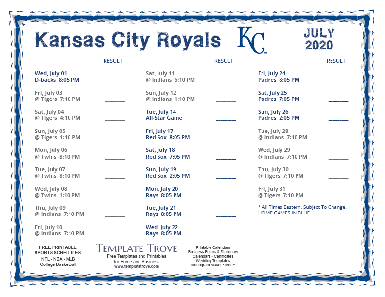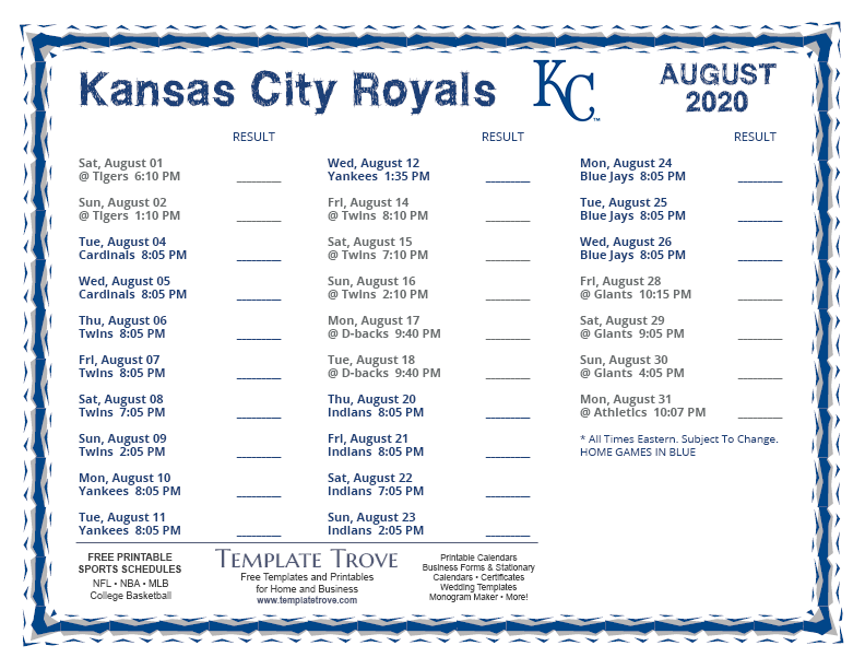 Keep up with the 2020 Kansas City Royals with our handy printable schedules, now available for each US time zone.