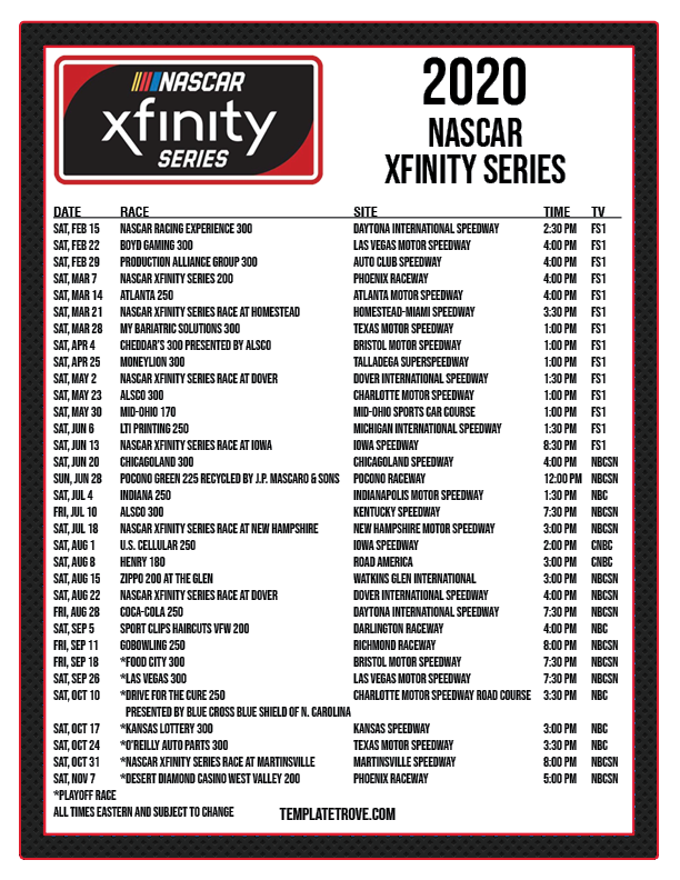 Keep up with the races with our printable 2020 NASCAR Xfinity Series schedules. Available for each United States time zone.Schedules print on 8 1/2" x 11" paper.