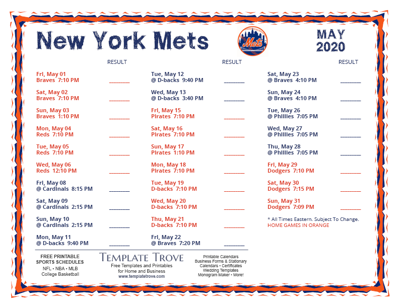May 2020 Mets Schedule