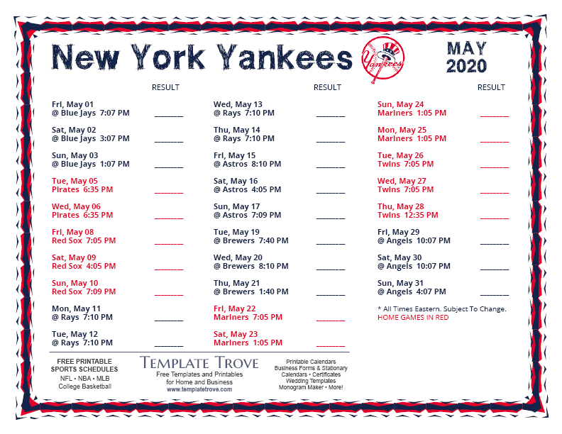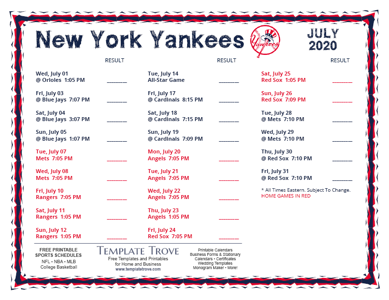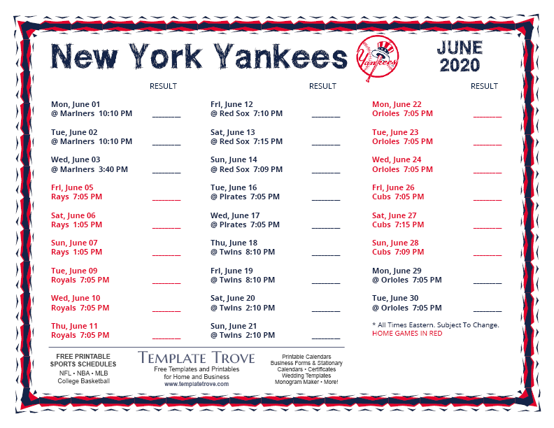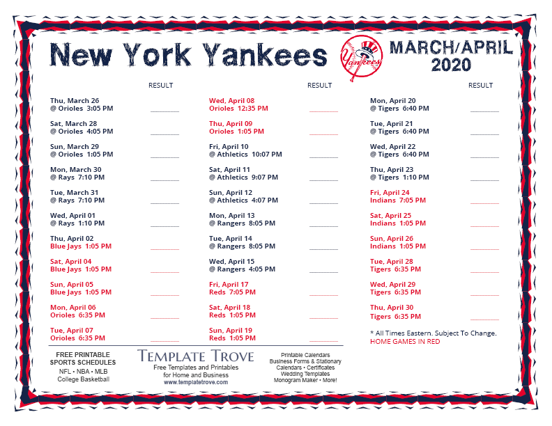 Keep up with the 2020 New York Yankees with our handy printable schedules, now available for each US time zone.