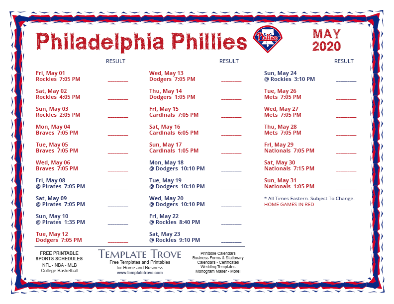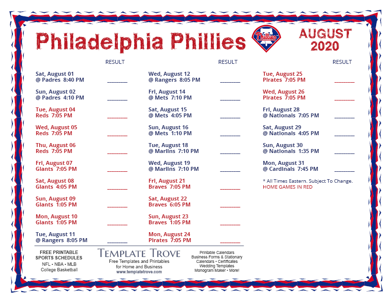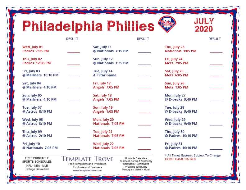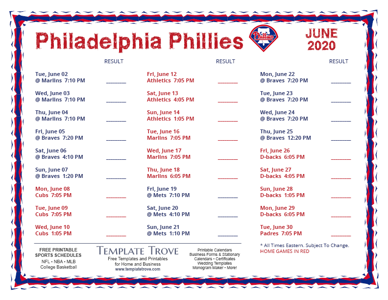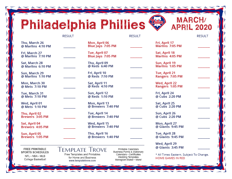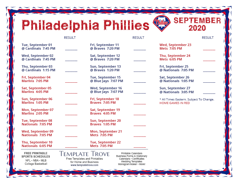 Keep up with the 2020 Philadelphia Phillies with our handy printable schedules, now available for each US time zone.