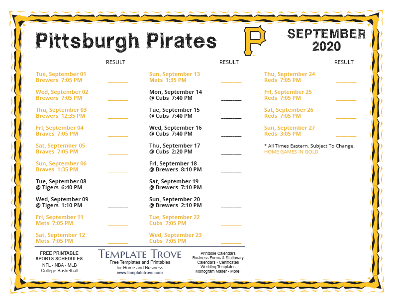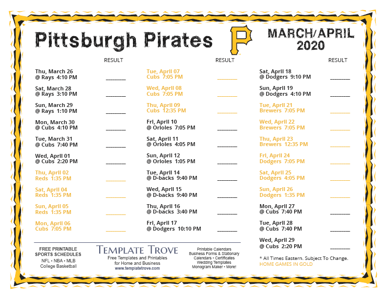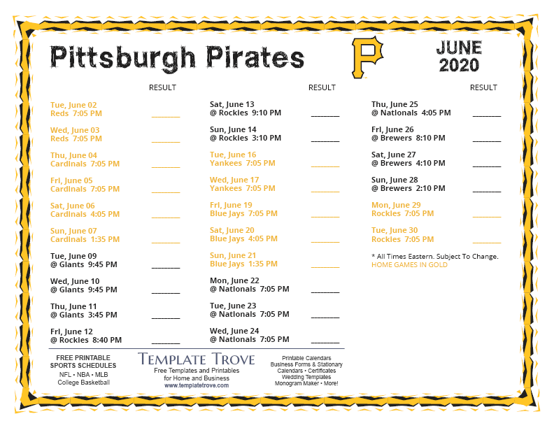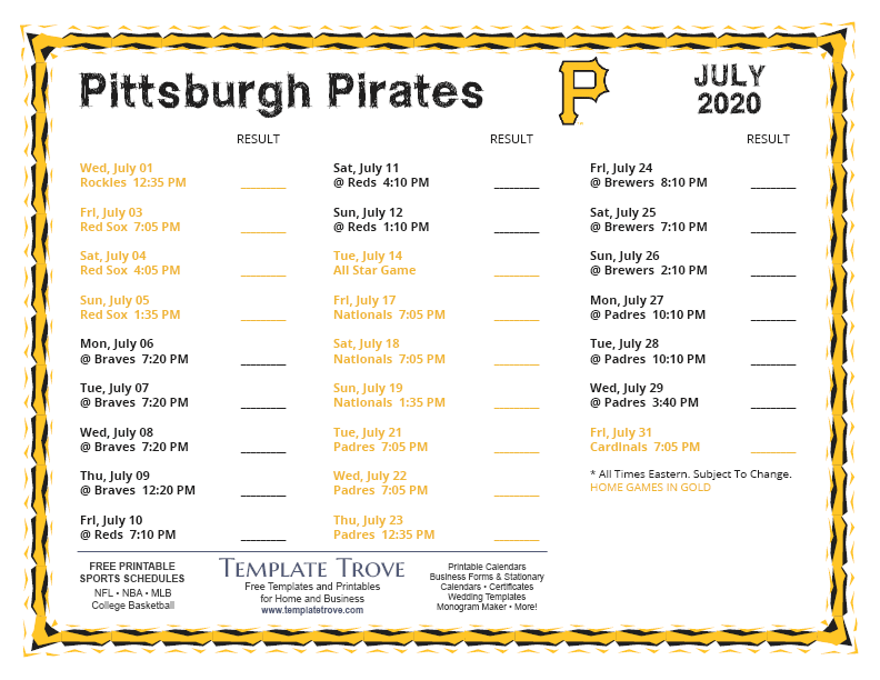 Keep up with the 2020 Pittsburgh Pirates with our handy printable schedules, now available for each US time zone.