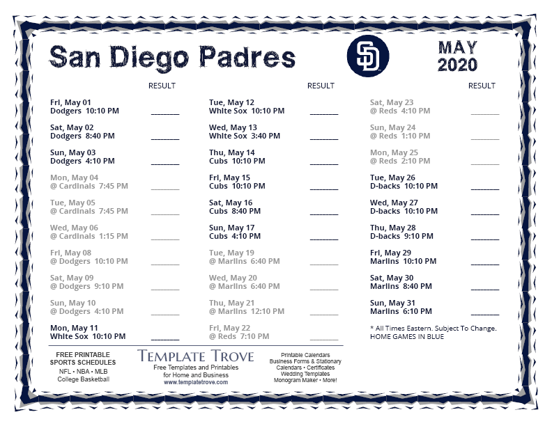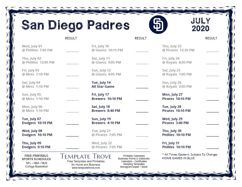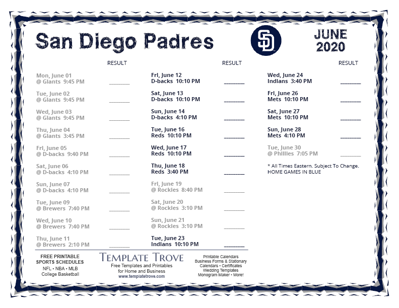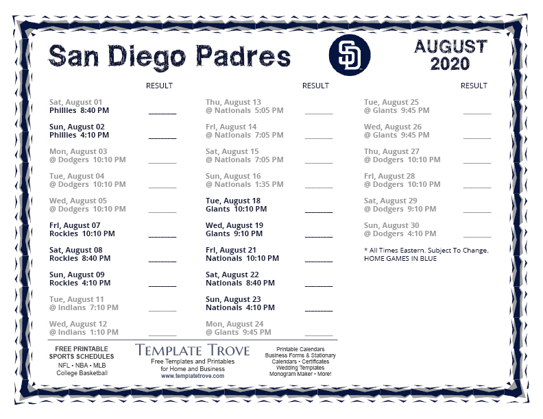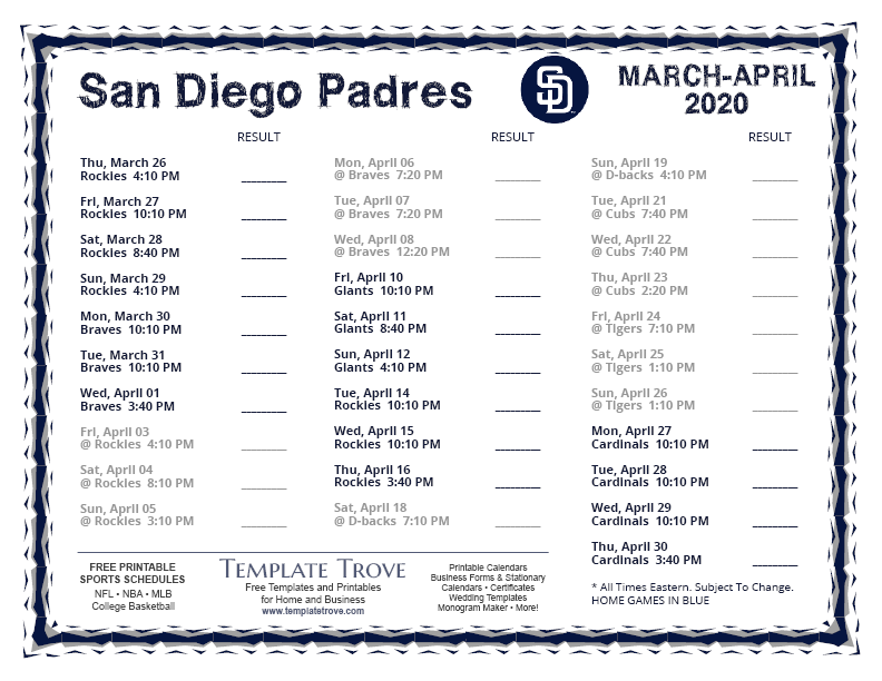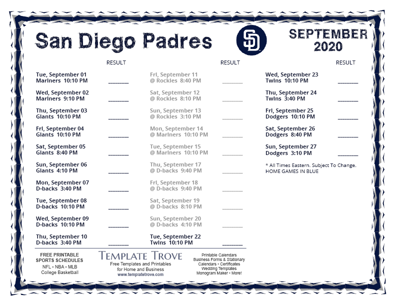 Keep up with the 2020 San Diego Padres with our handy printable schedules, now available for each US time zone.