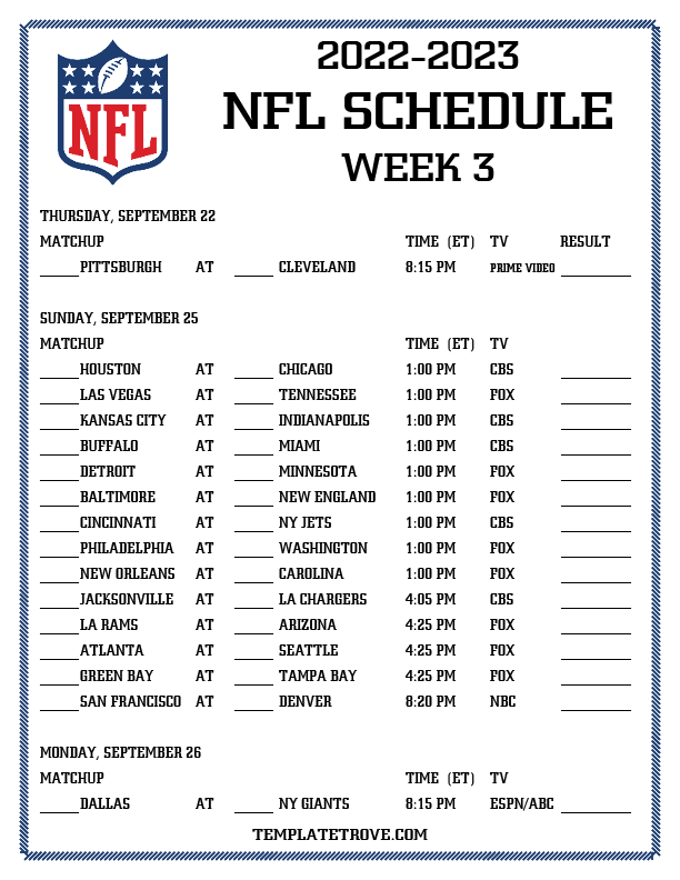 Printable 2022-23 NFL Schedule Week 3 - Central Times