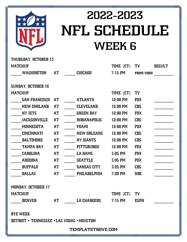 Printable 2022-23 NFL Schedule Week 6 - Central Times
