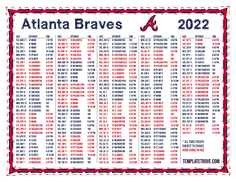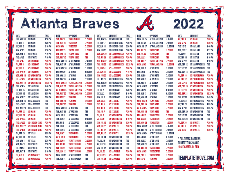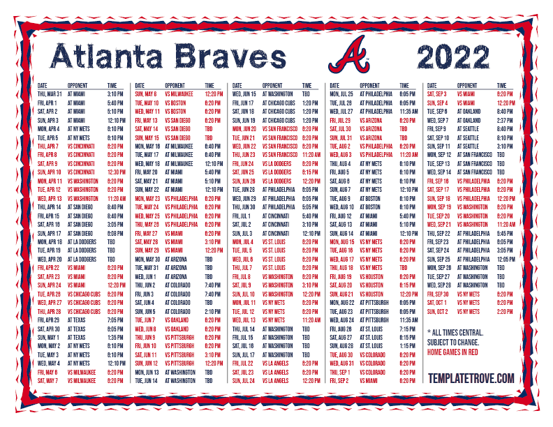 Keep up with the 2022 Atlanta Braves with our handy printable schedules, now available for each US time zone.