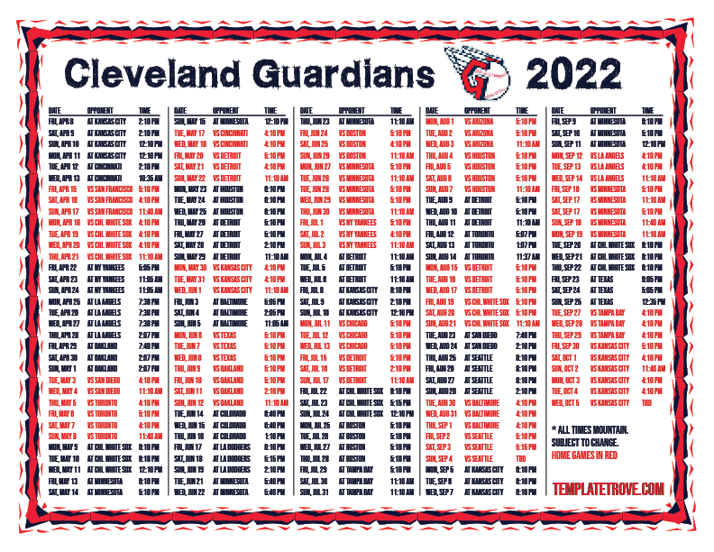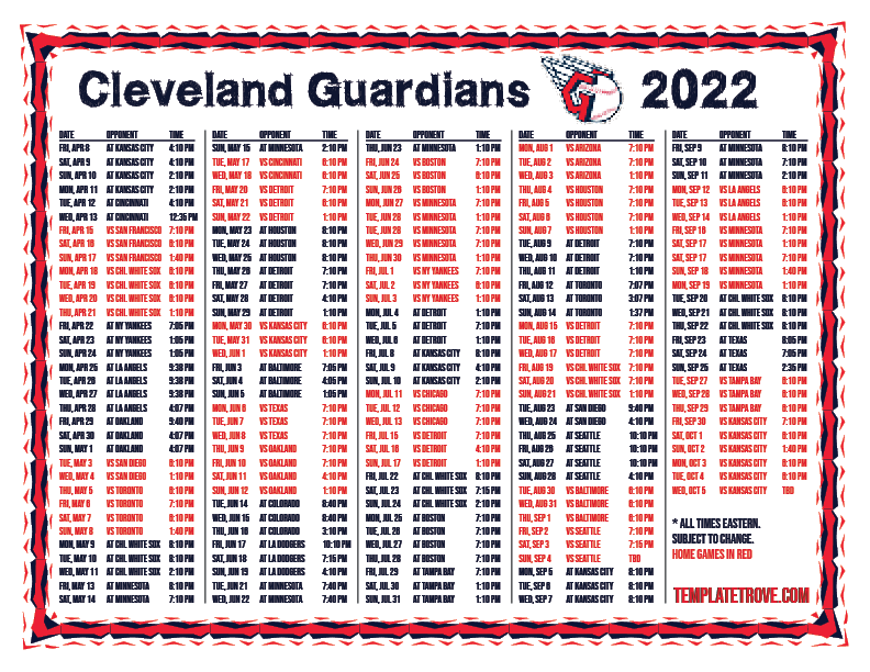 Keep up with the 2022 Cleveland Guardians with our handy printable schedules, now available for each US time zone.