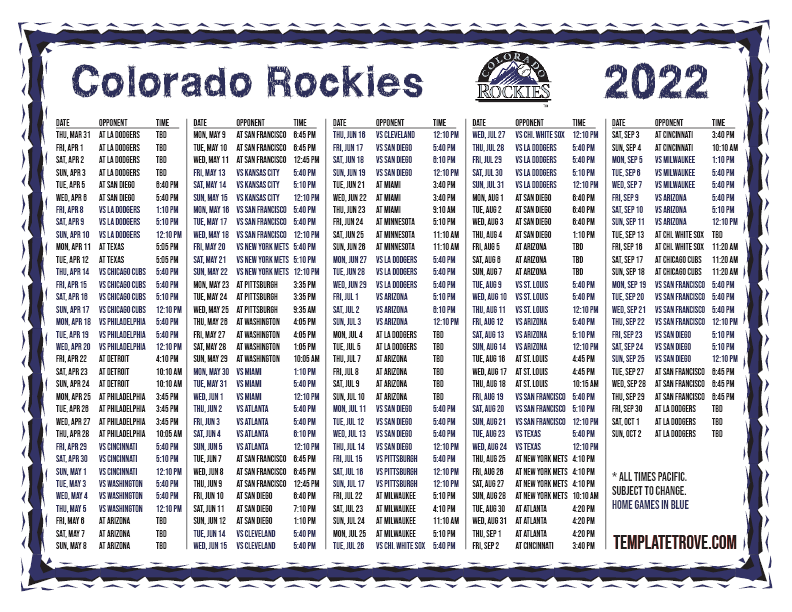 Keep up with the 2022 Colorado Rockies with our handy printable schedules, now available for each US time zone.