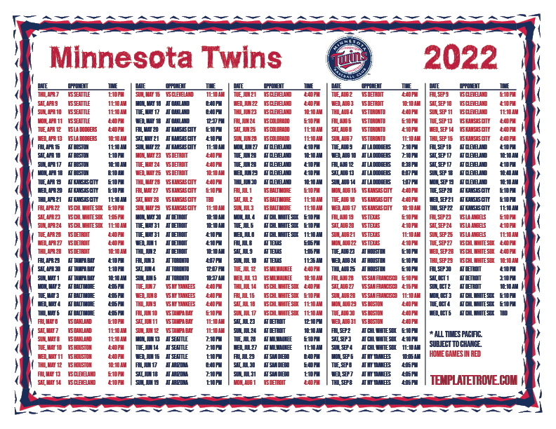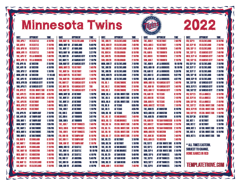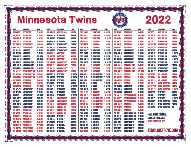 Keep up with the 2022 Minnesota Twins with our handy printable schedules, now available for each US time zone.