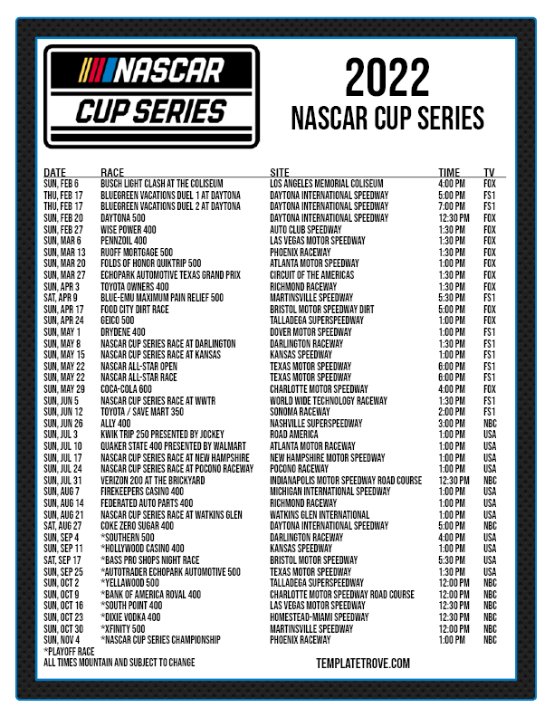 Keep up with the races with our printable 2022 NASCAR schedules. Available for each United States time zone.Schedules print on 8 1/2" x 11" paper.