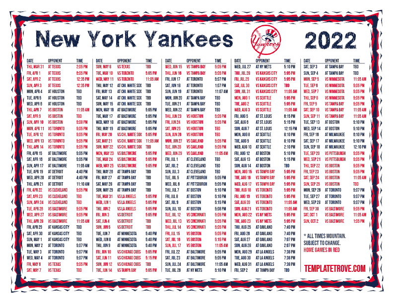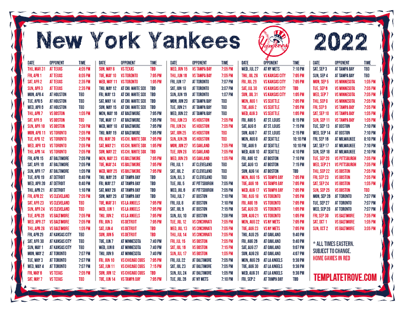Keep up with the 2022 New York Yankees with our handy printable schedules, now available for each US time zone.