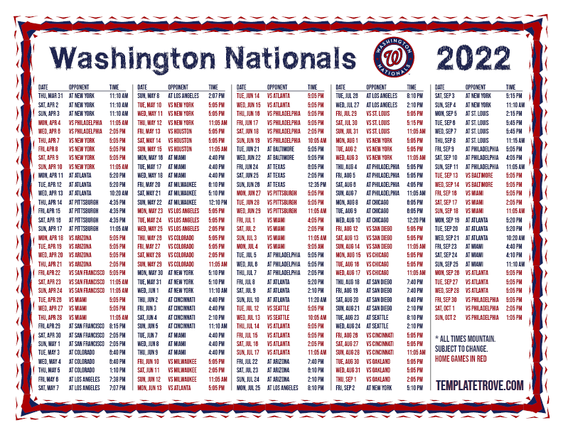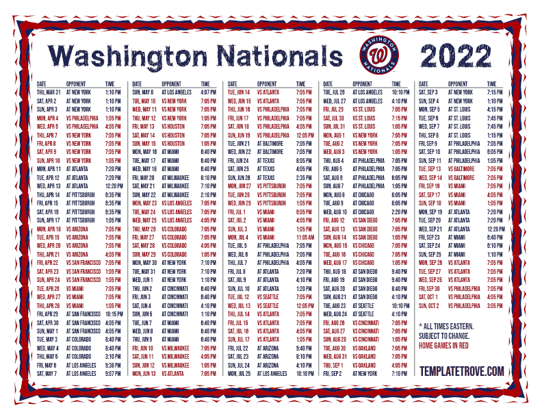 Keep up with the 2022 Washington Nationals with our handy printable schedules, now available for each US time zone.