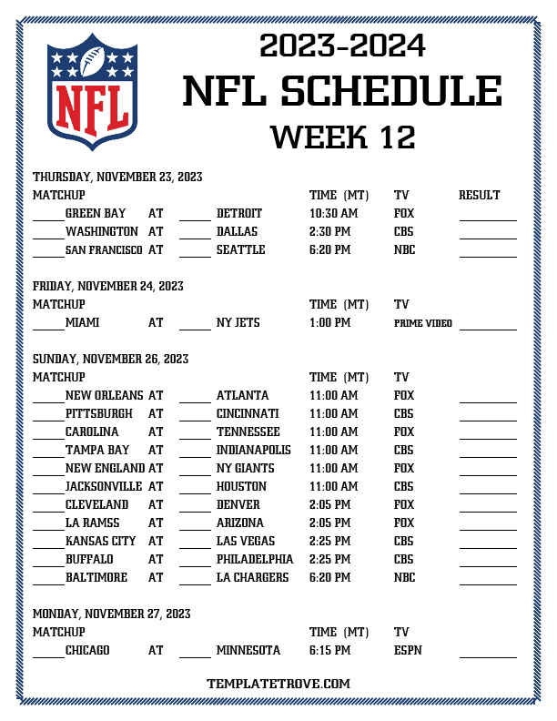 Printable 2023-24 NFL Schedule Week 12 - Mountain Times