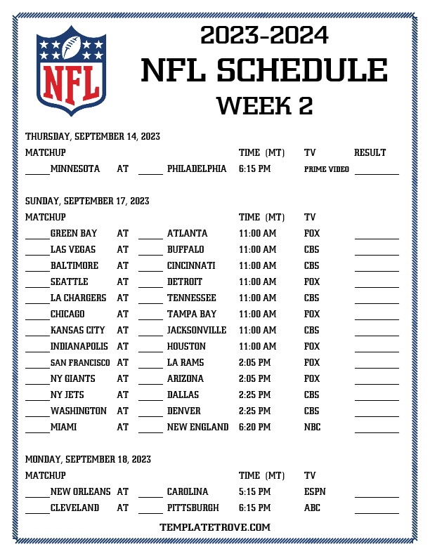 Printable 2023-24 NFL Schedule Week 2 - Mountain Times