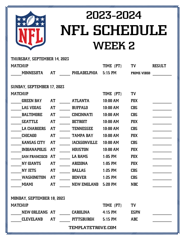 Printable 2023-24 NFL Schedule Week 2