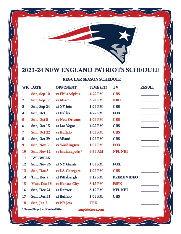 If you get a chance, please share the schedules through social media with your fellow Patriots Fans. It's easy, and it would help us out a bunch, just click one of the social share buttons at the right of the screen on desktop or the black share button at the bottom right on mobile phones.