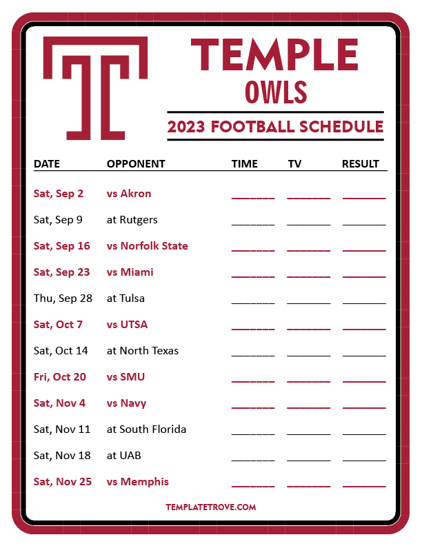 Style 3 - dates and opponents with columns to write in game times, TV network and results
