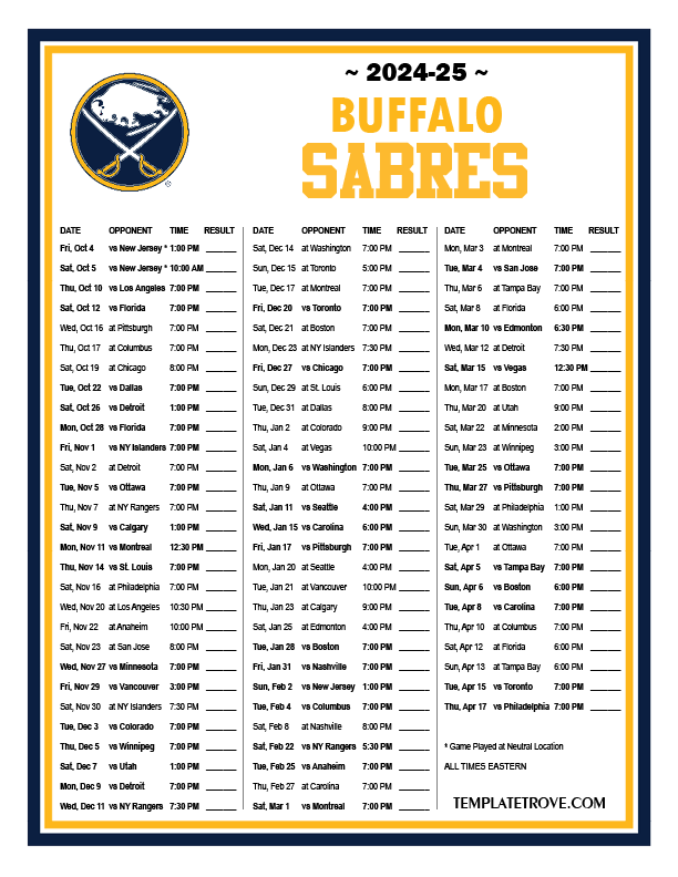 Keep up with the Buffalo Sabres in the 2024-25 season with our