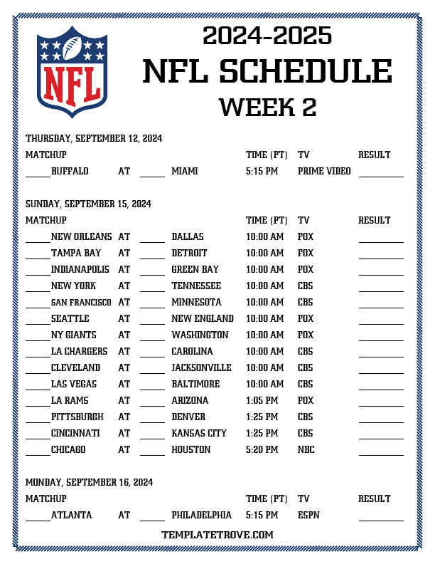 Printable 2024-25 NFL Schedule Week 2 - Pacific Times