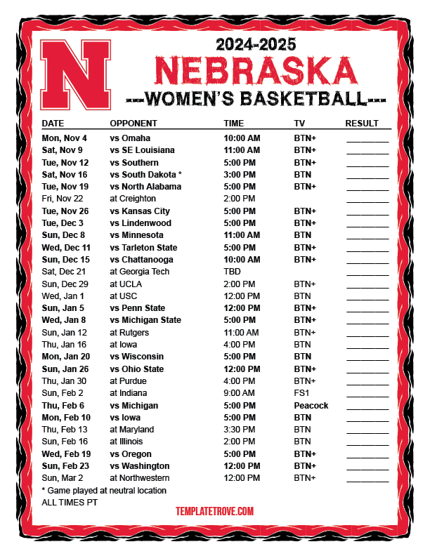 Keep up with the Nebraska Cornhuskers Women's Basketball in the 2024-25 season with our