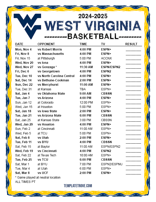 Keep up with the West Virginia Mountaineers basketball in the 2024-25 season with our