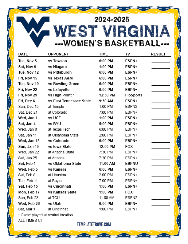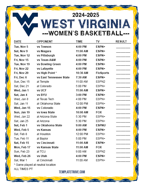 Keep up with the West Virginia Mountaineers Women's Basketball in the 2024-25 season with our