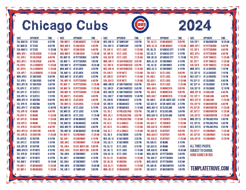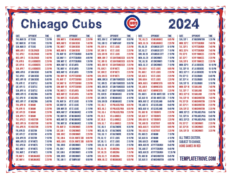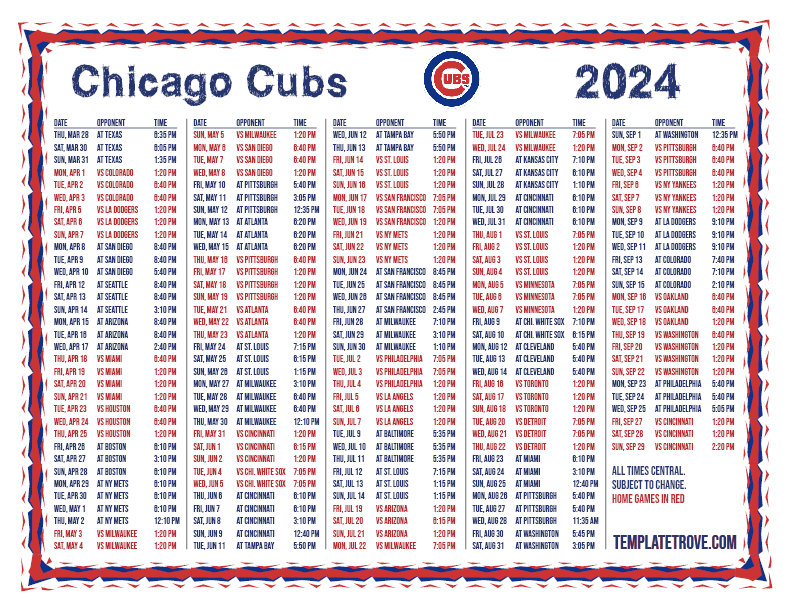 Keep up with the 2024 Chicago Cubs with our handy printable schedules, now available for each US time zone.