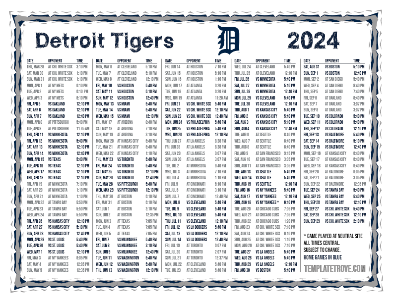 Keep up with the 2024 Detroit Tigers with our handy printable schedules, now available for each US time zone.