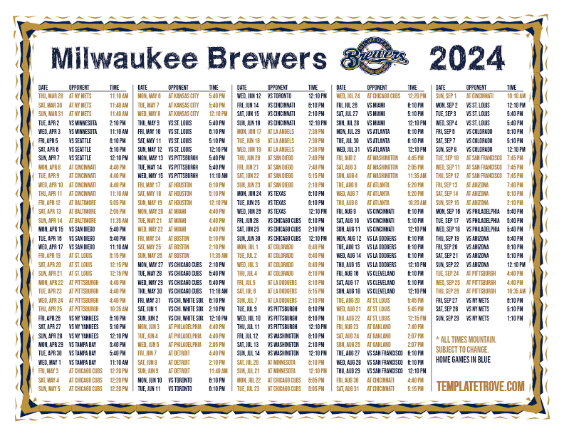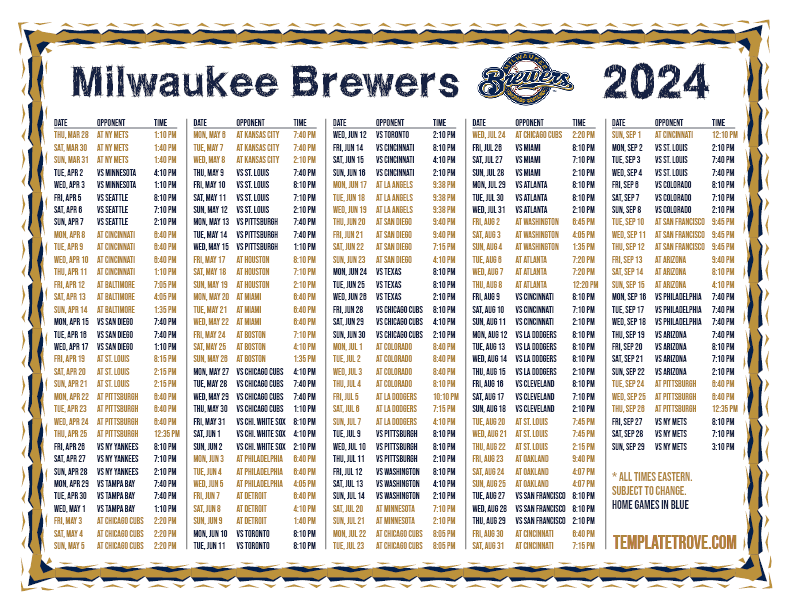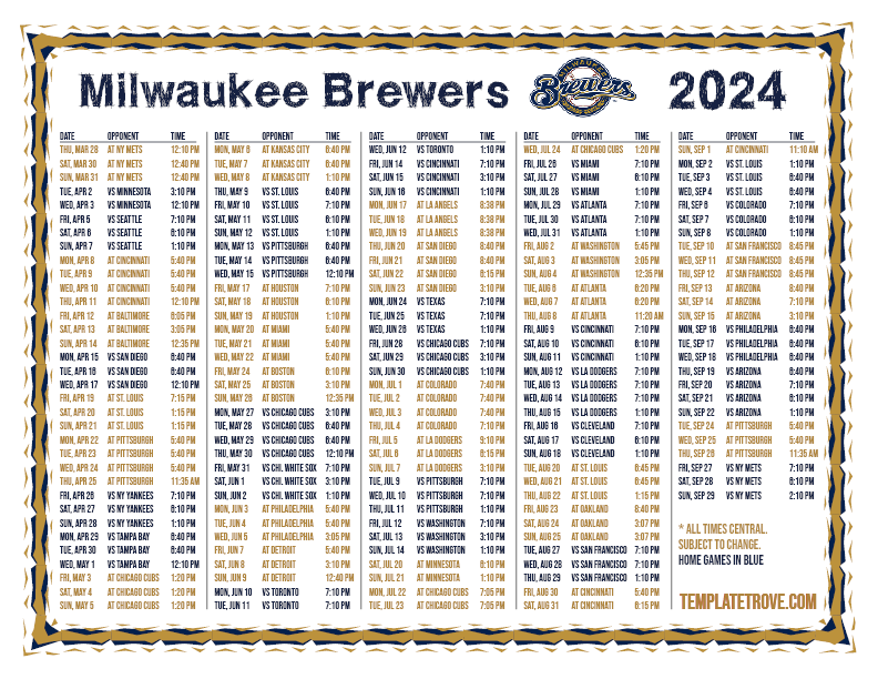 Keep up with the 2024 Milwaukee Brewers with our handy printable schedules, now available for each US time zone.